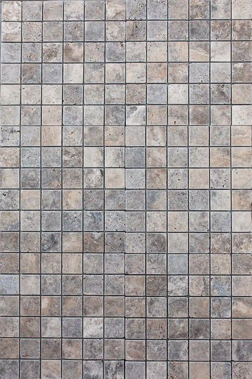 Kamień Trawertyn Ash to połączenie delikatnych odcieni beżu, szarości i kremu w formie drobnych kostek ułożonych na siatce.